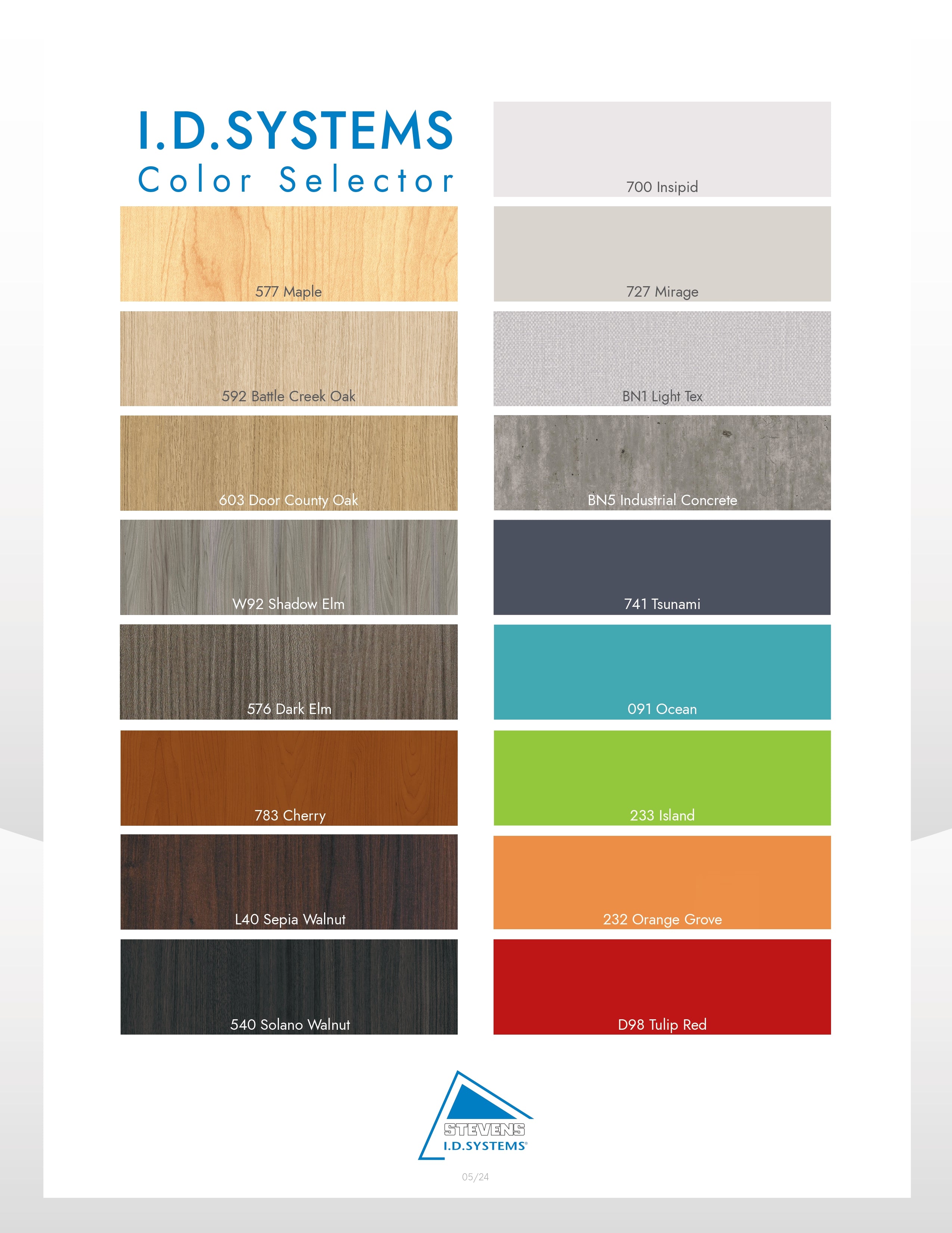 576 - Dark Elm, D98 - Tulip Red, 057 - Graphite Nebula, 783 - Cherry, 059 - Grey Nebula, 577 - Maple, 592 - Battle Creek Oak, 603 - Door County Oak, W92 - Shadow Elm, L40 - Sepia Walnut, 540 - Solano Walnut, 700 - Insipid, 727 - Mirage, BN5 - Industrial Concrete, 741 Tsunami, 091 - Ocean, 233 - Island, 232 - Orange Grove