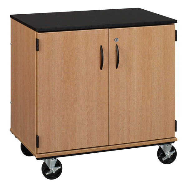 Storage on the move! This lab cart is designed for convenience with two adjustable shelves that create four compartments to store items you need to access in different areas. The locking doors provide security to make certain items stay in place. The sturdy cart rolls smoothly from area to area with the specially engineered casters! The black laminate top makes for a great work surface.